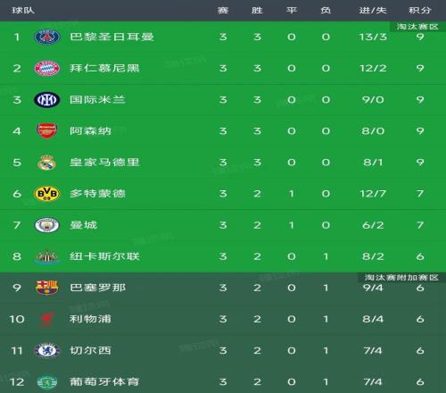 目前拜仁总进球数12球仅次于巴黎,暂列第二名。意甲球队国米4-0大胜圣吉罗斯联合,净胜球是9个暂列第三名。阿森纳主场4-0大胜马竞,净胜球是8个暂列第四名,他们和国米是唯二没有失球的!皇马今天凌晨主场凭借贝林厄姆的补射进球,1-0小胜尤文,迎来三连胜,净胜球是+7,暂列第5名。