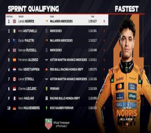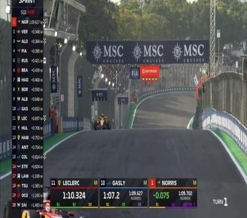 F1巴西站冲刺排位赛:诺里斯杆位,安东内利P2,汉密尔顿P11