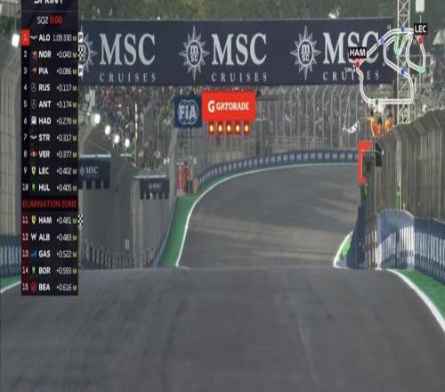 SQ2首轮飞驰圈结束,阿隆索处在榜首,两台迈凯伦排在二三,汉密尔顿处在淘汰区;