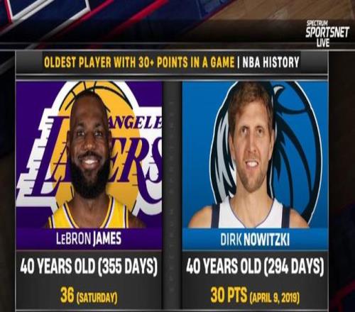 据统计,40岁355天的詹姆斯成为了NBA历史上单场比赛砍下30+得分最老的球员,此前的纪录保持者是独行侠传奇球星德克-诺维茨基,后者曾在2019年4月9日以40岁294天的年级拿到了30分。