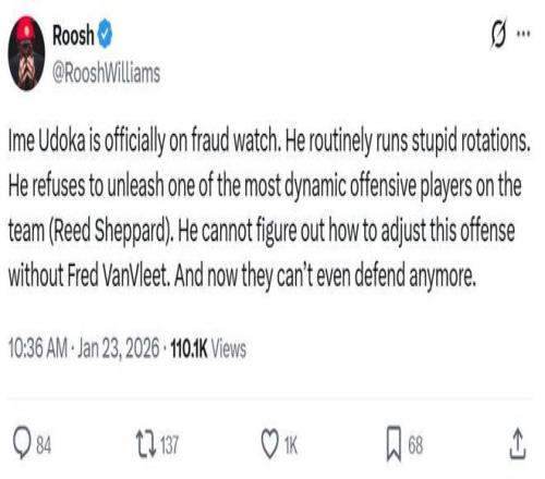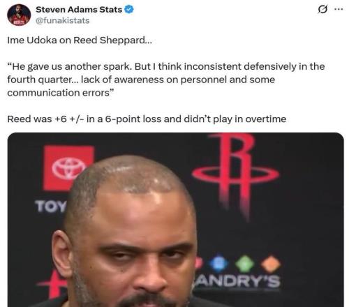 火箭媒体人Will更是发文直接点名乌度卡,表示自己真得需要乌度卡解释一下,为什么谢泼德登场机会这么少,而且每一次都是在其状态火热时发生,火箭队本赛季差不多有8-10场被逆转的比赛是从谢泼德使用出问题开始的。