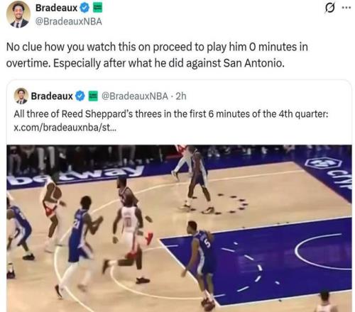 并不是只有Bradeaux一位火箭媒体人感到不解,大量火箭媒体人与当地资深球迷发声表达质疑,不理解为何谢泼德如此出色的三分手,却在进攻体系中完全无法获得任何战术安排。